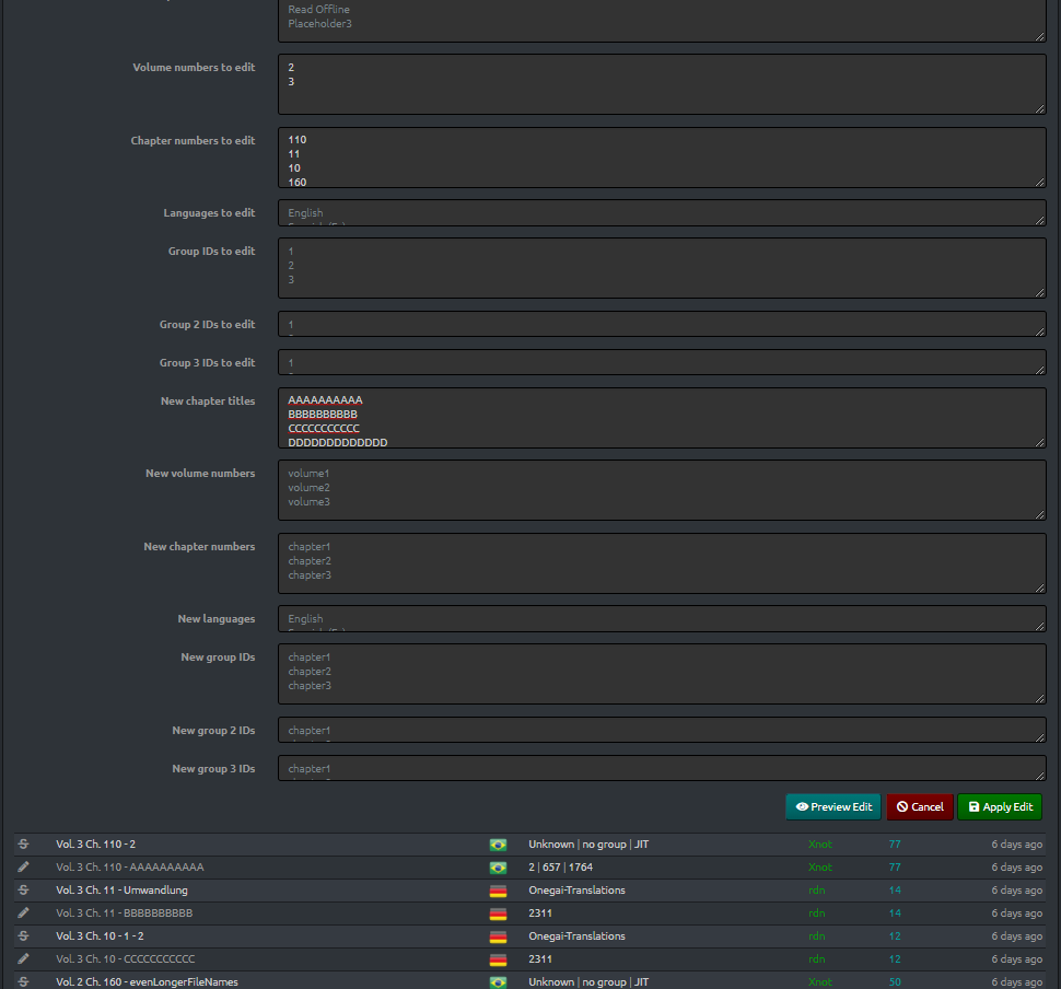Adds a mass edit button to the manga page in MangaDex, which opens a mass edit form which allows editing multiple chapters sequentially by inputting values in each line.