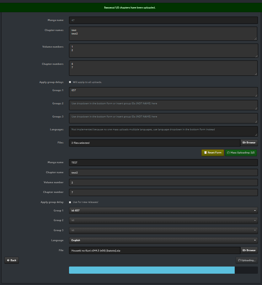 Adds a mass uploading form to the upload page in MangaDex, which allows uploading multiple chapters sequentially by inputting values in each line.
