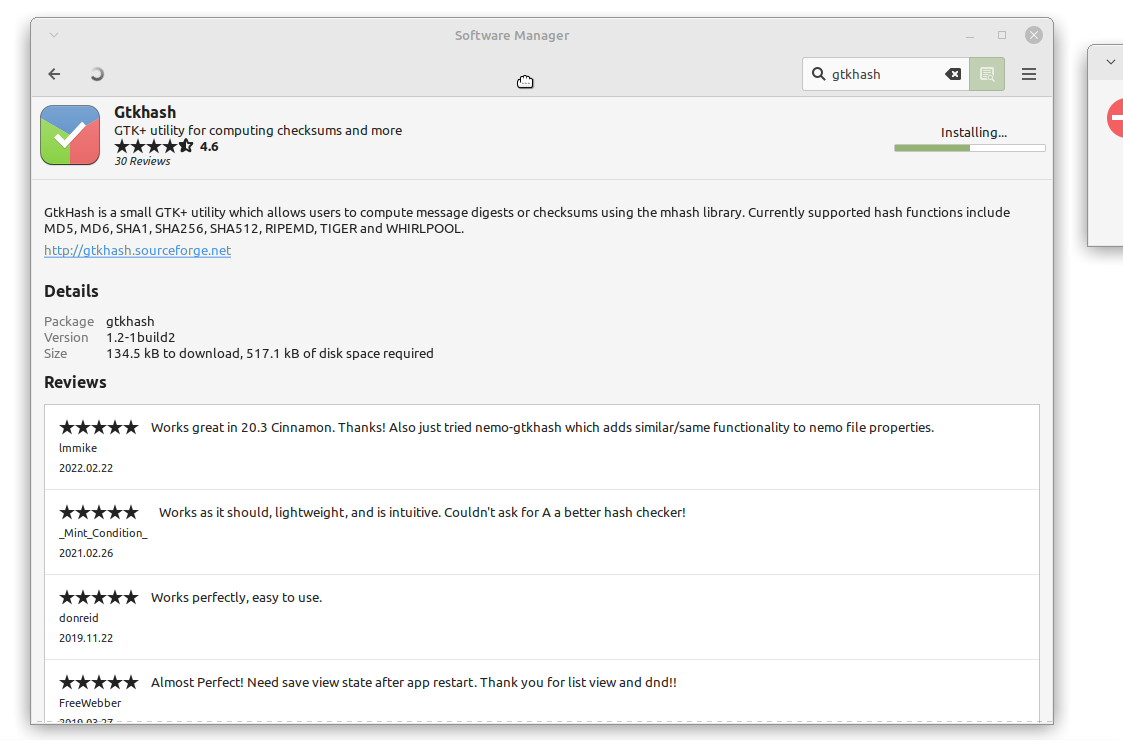 - with your network connection still disconnected, try to install 'GtkHash' (or whatever other application you chose)