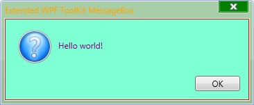MessageBoxResult result = Xceed.Wpf.Toolkit.MessageBox.Show("Hello world!", "Extended WPF ToolKit MessageBox", MessageBoxButton.OK, MessageBoxImage.Question);